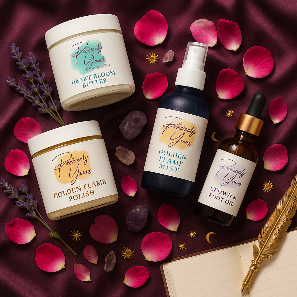 Your crown is divine, Goddess. At Precisely Yours, we honor that truth by creating hair and body care that transcends the surface. Infused with Reiki energy, every oil and butter carries both nourishment and intention — calming your spirit, restoring balance, and reminding you that your beauty is sacred. This is more than self-care. It is ceremony, crafted for the Queen you are.